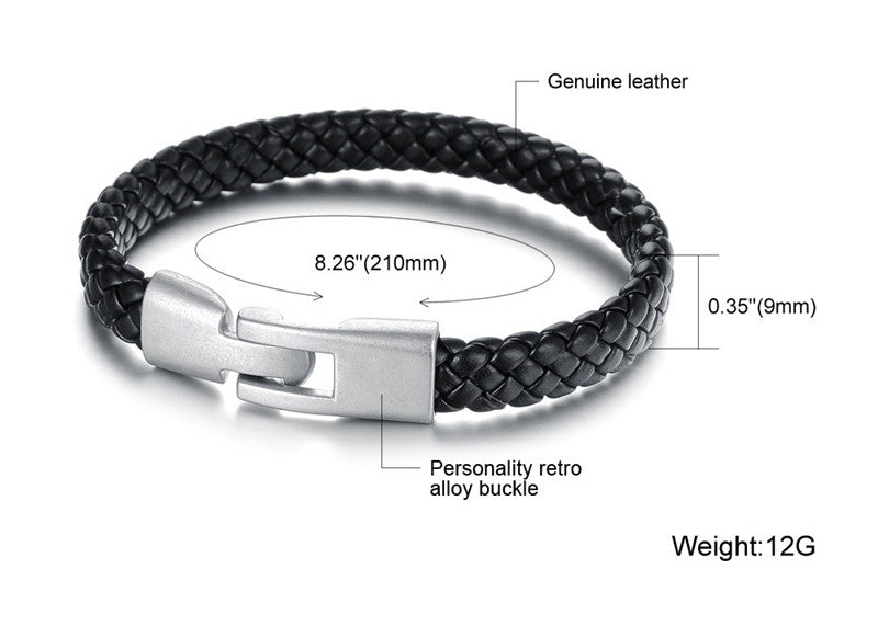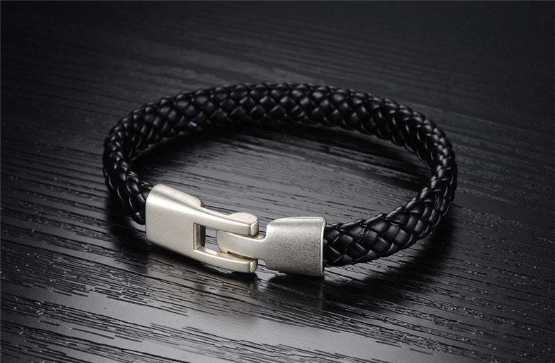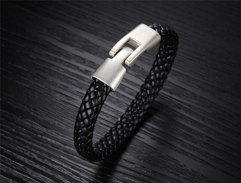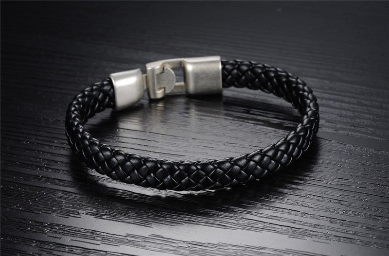 Black Genuine Leather Weaved Knitted Wristband